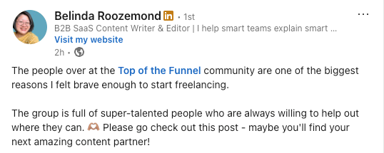 Find your next project or long term role. Top of the Funnel members actively share great work opportunities every week.